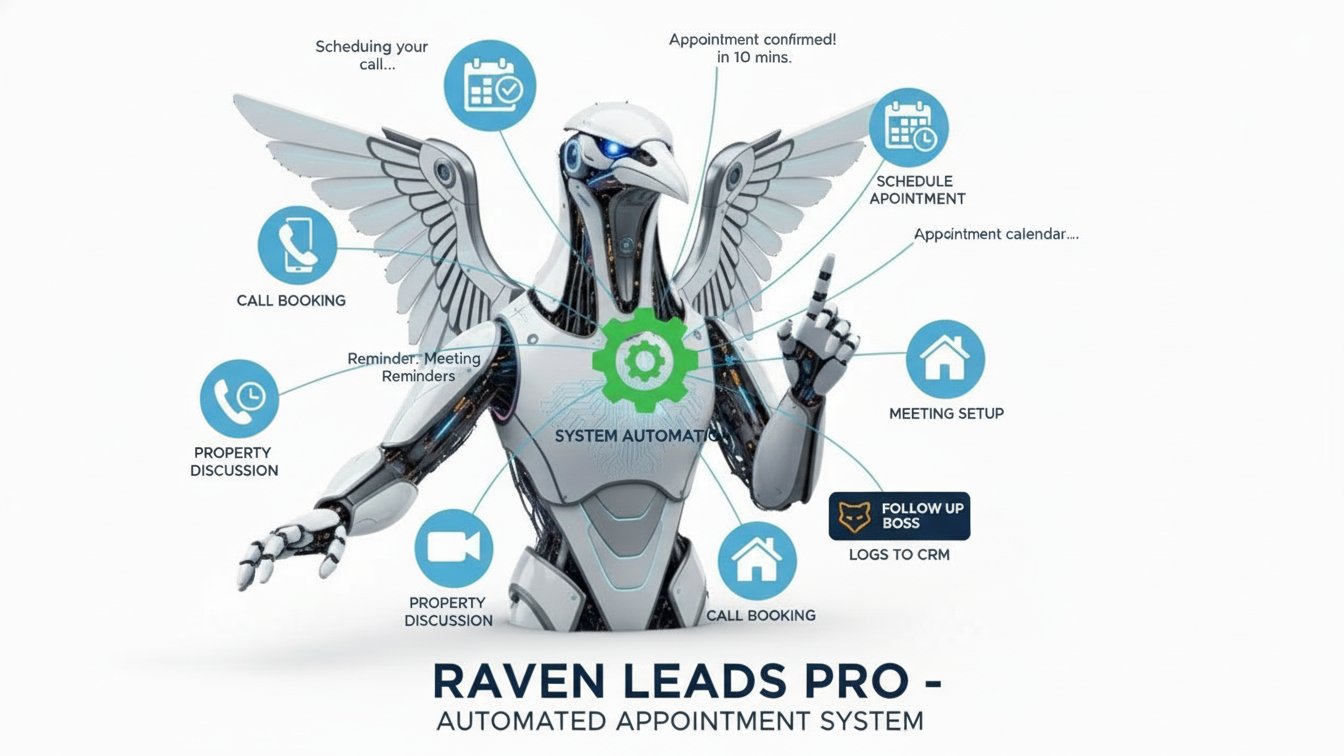 Raven Leads Pro includes a built-in appointment system that automatically schedules calls, meetings, and property discussions based on lead intent and availability. Once a lead engages, the system can route them to the right calendar, send confirmations and reminders, and log appointments directly into Follow Up Boss, ensuring no opportunity is delayed or overlooked.